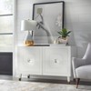 Sophisticated elegance makes a bold statement with the Jaslene Buffet designed by angelo:HOME. This stunning cabinet features unique carved door detail and impressive oversized Lucite doorknobs for a glam look. Squared tapered wood legs accented with brass tone leg brackets complete the design of this high gloss white finished cabinet. An added adjustable shelf provides ample space for storing dining pieces of various size or media components as a console in your living area.
