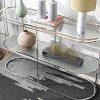 Catch the eye of friends and family alike with the stellar, modern style of this contemporary metal console table. Its oval shape and lower shelf bring eye-catching flair as the shelf create a compelling effect with rippled glass. The top is clear glass, ideal for showing off decor and greenery or flowers. A chrome finish completes the design with gleaming, modern appeal.