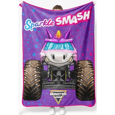 - Inspired by the adrenaline-pumping world of Monster Jam, this plush throw blanket with Sparkle Smash combines bold colors with a fun, fresh style. Blending excitement with coziness and character, its the perfect addition to any space, bringing a touch of monster truck adventure to your home.