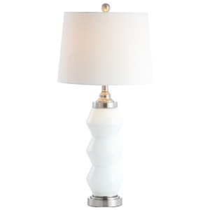 Introducing the Jayce 29 inch glass table lamp, designed to be a striking addition to any living space. The lamp features a sleek combination of white and silver, providing a touch of modern elegance. Standing at an impressive 29 inches, it effortlessly enhances the ambiance of your room, casting a warm and inviting glow. The glass material not only adds a sense of sophistication but also complements both contemporary and classic decor styles. Ideal for a bedside table or as an eye-catching piece in your living room, the Jayce lamp is a stylish and functional lighting solution. Embrace the perfect blend of design and utility with this stunning table lamp.