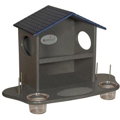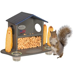 Invite your furry friends to dine at the JCs Wildlife Small Squirrel Snack Station! With included metal stakes, an inner buffet area for peanuts, and a place for small fruits, your squirrels will be easily fed and away from your precious bird seed. Our Snack Station is constructed with durable and resilient eco-friendly recycled poly lumber, which is built to last through the seasons while looking sharp in your garden. This squirrel feeder also features a weather roof to keep your peanuts dry and free from spoilage due to moisture buildup. Your feeder will also come with two 3" mounting screws for easy installation to a squirrel friendly tree, and once your feeder is mounted, simply refill as needed to keep the snack station in business. Proudly made in our Southern Indiana production shop! Specifications: Overall Dimensions: 12.5" H x 16.5" W x 10.5" D Construction: Recycled Poly Lumber Animals That Would Use This Feeder: Squirrel Seed or Feed Options: 2 ears of corn, whole peanuts, and small fruits Origin Country: Proudly made in the USA!