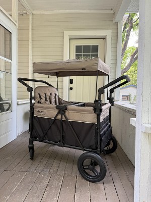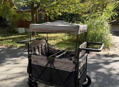 A: The Jeep Gladiator 4-Seater Stroller Wagon’s overall dimensions are 56.5" L × 29.92" W × 46.45" H. The usable space is slightly smaller than the exterior frame. If you’re looking to place a mat inside, we recommend measuring around 29" wide and just under 40" long as a safe guide.
