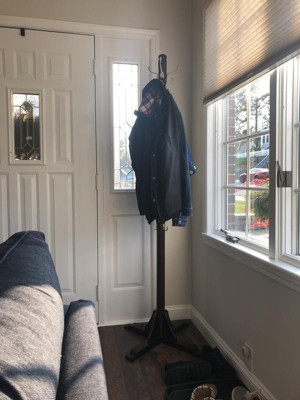 - Dark brown coat rack has a classic look