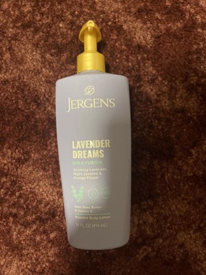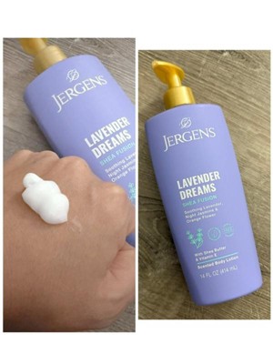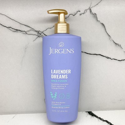 - FEEL GOOD, JERGENS LOTION - Our dermatologist-tested Jergens Shea Fusion Lavender Dreams scented body lotion is cruelty free, paraben free and contains no artificial dyes