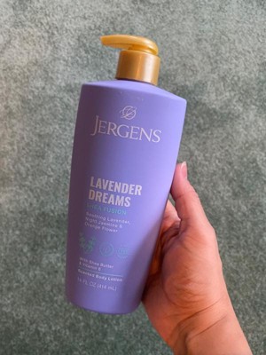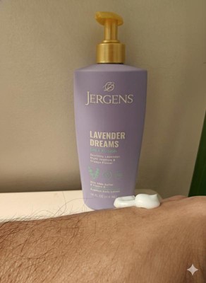 [This review was collected as part of a promotion.] I received Jergens Lavender Dreams lotion to try and I am very happy with it. The lavender scent is gentle and relaxing, nice for bedtime or after a shower. The lotion feels creamy when I pump it out, but it rubs in fast and does not leave my skin greasy. My skin feels soft and smooth for many hours, especially on my arms and legs. I also like that it has shea butter and vitamin E for extra moisture. I would recommend this lotion to friends and would buy it again.