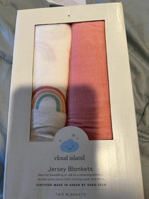 Lend whimsical touch to your little one's nursery decor with this Two-Pack of Jersey Swaddle Blankets from cloud island™. Made with soft jersey fabric, these swaddle blankets feature knitted construction to help keep your baby warm as you swaddle them. They can also be used as a cozy surface for changing, or as a burp cloth, a stroller cover and more. This swaddle blanket set includes one solid peach blanket and one with rainbow print over a white background, giving you two cute options for keeping your little one comfy.