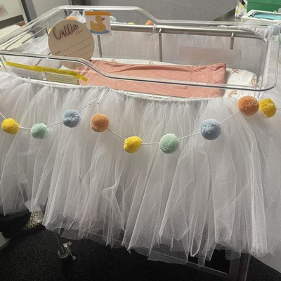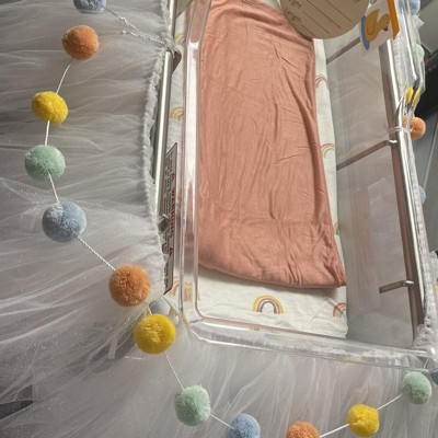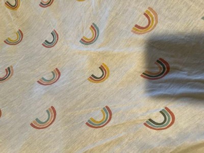 - Includes 1 solid peach and 1 rainbow-print sheet