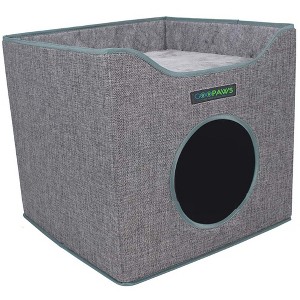 JESPET & GOOPAWS: FOLDABLE CAT CONDO - Provide your kitty with a place to lay and play with the JesPet Foldable Cat Condo! This GOOPAWS 15.5'' x 15.5'' x 15.0'' cube easily fits in any room without taking up too much space. It’s lightweight, sturdy and designed with a padded platform and a hideout area. Its crafted using wood panels, a durable linenette fabric for the exterior and a felt interior to accommodate those sharp claws. Every cat condo also comes with a reversible cushion for added comfort during the warmer and cooler months. Summer; breathable fabric cloth. Winter: Sponge and flannel fabrics. And since it’s completely foldable, it’s easy to move and store! Stable Construction: Lightweight and sturdy construction supports pet sorts of activity, places to sleep, padded platform, reversible cushion in two design options on lower level: hand wash. Perfect for indoor use!