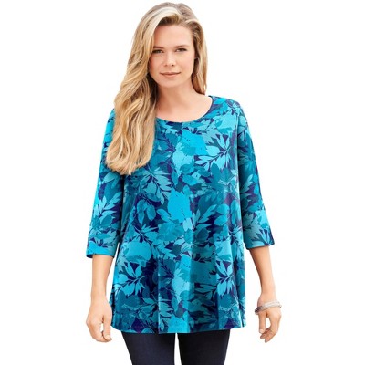 The Jessica London women's plus size Stretch Cotton Scoop Neck Tee is the perfect way to top off any look with three-quarter sleeves for season-spanning style. The straight silhouette offers a polished and figure-flattering look that eases over dress pants, skirt, jeans and capris.