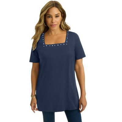 Studded embellishments add a unique touch to the Jessica London women's plus size V-Neck Embellished Tunic from the Everyday Knit Collection. Pair it with other essentials from our Everyday Knit Collection, such as our Wide Leg Pantsor Wide Leg CropPants—you reallycan't go wrong..