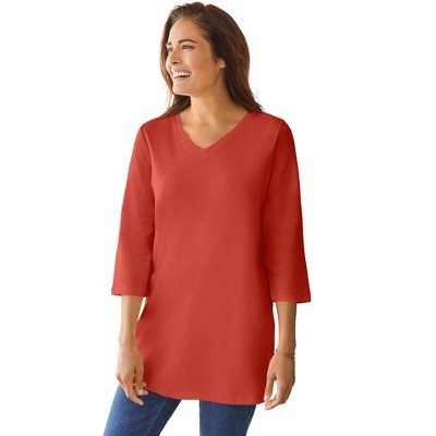 A casually sophisticated knit top with gold tone buttons on the shoulders. This timeless boatneck tunic is a staple in everyday essential for every body. The universally flattering relaxed fit is easy to dress up or down for any occasion, and the longer, tunic length eases over all of your favorite bottoms. Available in bright, bold hues, as well as pretty patterns and prints, you can wear this tunic everyday. Three-quarter sleeves. Side slits. 30" long. Cotton/spandex. Machine wash. Imported.