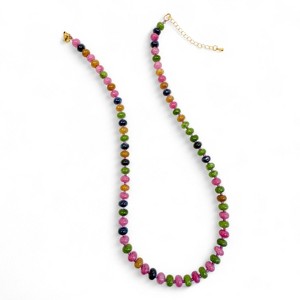 - Stone: 6mm genstone quartz rondelle beads: Dark Pink, Navy, Green, and Brown Length: 18" Clasp: Gold-plated stainless steel toggle clasp (tarnish-resistant and waterproof) Fit: Structured and striking; sits just at or below the collarbone