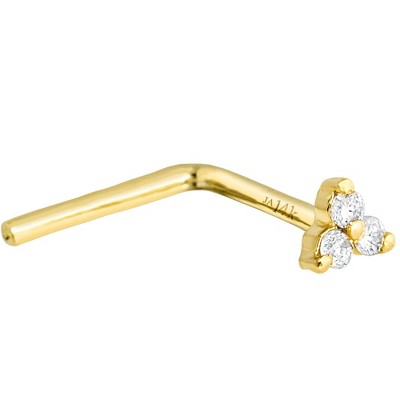 Enhance your nose piercing with our elegant Jewelry Avalanche 3-stone l-bend nose stud. Made of 14K solid gold, this 22G l-shape stud features three sparkling genuine diamonds totaling 0.03ctw. Elevate your style with luxury and shine. Sleek and stylish, this diamond nose ring adds a touch of elegance to your look while staying securely in place.