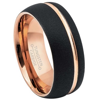 Elevate your style with our Jewelry Avalanche 8mm Black IP Sand Blasted Finish Off Center Groove Men's Tungsten Carbide Wedding Band. Made with rose gold and black ion-plated tungsten, this ring is durable and exudes elegance. Its comfort-fit and the dome design ensure a comfortable fit. Perfect for any occasion, from weddings to everyday wear. Band details: