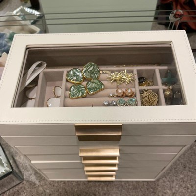 I've had this box about a year. I outgrew my highschool and college jewelry box with pieces from my mom and mother in law, and a lot from a owner retiring high end store as well as a vintage jewelry store, where the huge selection and great prices make me like a kid in a candy shop. I checked out 4-5 other brands and sizes, but this met my needs the best. What would I tweak if I could? 1). no empty drawers without compartments, I need to organize everything; 2) include several sets of dividers for customization. If I were more coordinated I could make them but they'd look like a kids' summer camp project. 3) Please include Two drawers with necklace hooks My dresser space precludes the use of hanging necklaces on fold out wings. 4) A perforated flap or panel over the top drawer, for stud earrings. 5) Watch pillows in all the cubbies in the two bottom drawers. At first I didn't know what they were for: I don't have a bunch of watches, but I wrap bracelets around them, and I hope to be able to purchase some extras for the other cubbies. Get this box; it's a nice size, you can remove or rearrange someof thedividers, it doesn't take up much room, and it's a good organizer. I now have seven jewelry boxes and this one is the tidiest. PJ