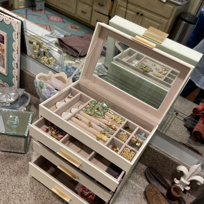 This jewelry box has a ton of storage, and it's so cute! The drawers with smaller sections are great for my earrings collection.