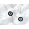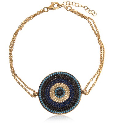 The Irem adjustable bracelet matches the Irem necklace, featuring a beautiful display of canary yellow, blue, and black cubic zirconias set in a concentric pattern. Nano turquoise mini beads uplift your energy with their baby blue shade, creating a lucky evil eye charm.