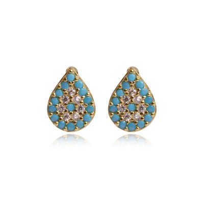These pear-shaped gold plated 925 sterling silver studs are lightweight and easy to mix and match. Or, wear them solo on any earring hole as the main attraction. Glistening round cut blue and white cubic zirconia stones set into an artistic display reveal an abstract evil eye. Butterfly backs keep them secure.