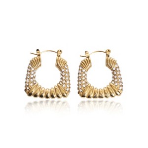 Our seashell scalloped Yana hoop earrings are fashioned into a retro geometric tapered square, all finely crafted in a rich shine with 18k yellow gold plated stainless steel. Glistening round brilliant cut crystals set in intervals give these gold hoops a color block effect. Click-top hinge posts make them perfect for slipping on before you leave.