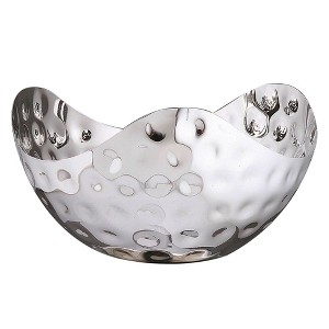 - The bolt-hammered surface of this serving bowl is pitted in some areas and raised in others.
