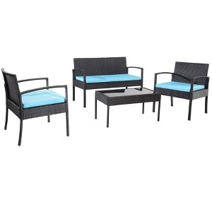 - Set includes: One loveseat sofa, two chairs, one table, and seat cushions