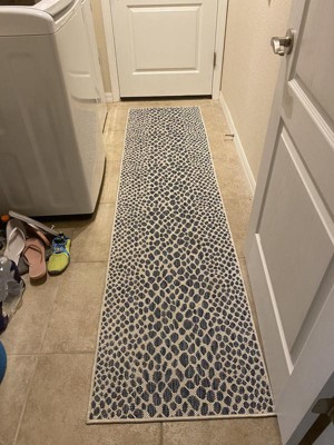 I had previously purchased the Ballard Designs feline rug, which is a blue background with white print. This is opposite but compliments my other rugs perfectly. I bought this rug and the Jill Zarin blue stripe. Love them both. High quality, easy to clean, very stylish. I was looking for something to put down so my senior lab would not slip and these were perfect! Love the blue! Will definitely purchase more. Oh, and awesome customer service too! A+