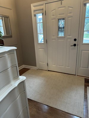 Height allows my front door to open without brushing it. Light gray threads woven in give it beautiful depth. It's been three weeks and have not experienced much shedding.
