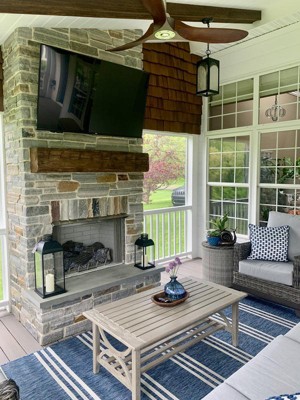 This beautiful blue and white outdoor rug was exactly what we needed for our outdoor living space. This 7x10 rug fits perfectly under a 10x14 pergola. Its soft enough in bare feet, but sturdy enough for all the dirt and life outside.