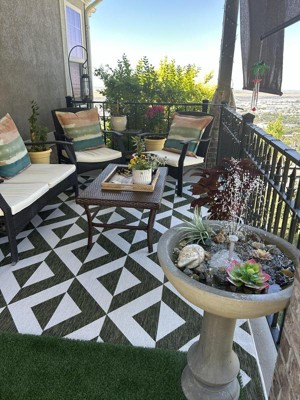 • EASY CARE: For an outdoor rug, remove debris frequently with the use of a broom or blower. To wash, spray the surface with a soap and water mixture, then rinse thoroughly with a garden hose and hang over a railing to dry thoroughly. Rotate for even wear.