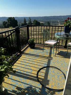 • EASY CARE: For an outdoor rug, remove debris frequently with the use of a broom or blower. To wash, spray the surface with a soap and water mixture, then rinse thoroughly with a garden hose and hang over a railing to dry thoroughly. Rotate for even wear.