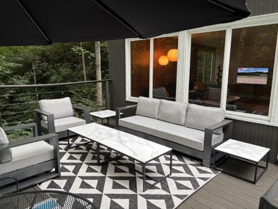 A: Yes, its flat-weave pile allows for seamless placement under furniture both indoors and outdoors.