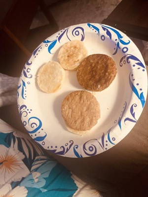 Two stars for taste and ease of heating. Convenient, the biscuit is tasty, sausage patty has tiny pepper flakes, so a hint of a kick to it. I enjoy eating them and the kids like them occasionally. Good swap for fast food, BUT the size of the biscuits were laughable. Maybe one more star for a good afternoon of laughter. I’d buy again, but only until I find an alternative.