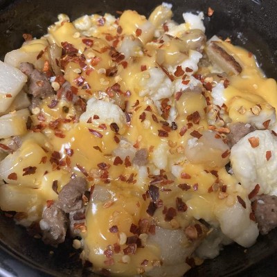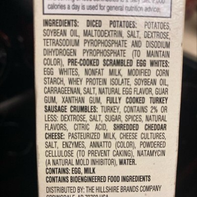 diced potatoes: potatoes, soybean oil, maltodextrin, salt, dextrose, tetrasodium pyrophosphate and disodium dihydrogen pyrophosphate (to maintain color), pre-cooked scrambled egg whites: egg whites, nonfat milk, modified corn starch, whey protein isolate, soybean oil, carrageenan, salt, natural egg flavor, guar gum, xanthan gum, fully cooked turkey sausage crumbles: turkey, contains 2% or less: dextrose, salt, sugar, spices, natural flavors, citric acid, shredded cheddar cheese: pasteurized milk, cheese cultures, salt, enzymes, annatto (color), powdered cellulose (to prevent caking), natamycin (a natural mold inhibitor), water