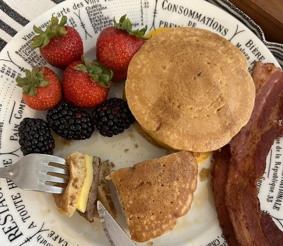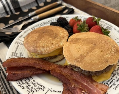 Breakfast pancake and sausage sandwich