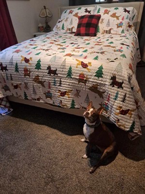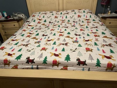 [This review was collected as part of a promotion.] The Jingle Paws Reversible King Quilt Set is a welcome holiday addition to any bedroom. The holiday dressed dogs and Christmas trees bring in the holiday cheer and the red, green and white plaid on the reverse side is a beautiful contrast. It is very warm and comfortable and is machine washable.