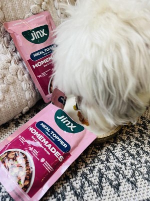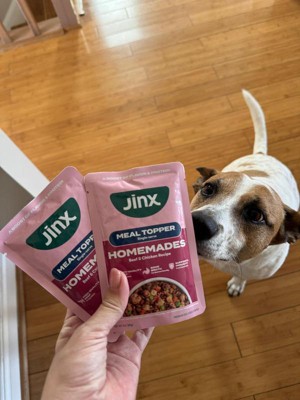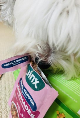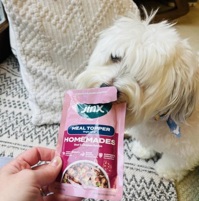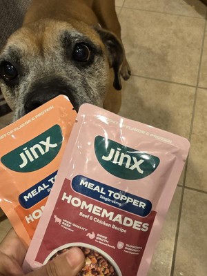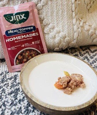 [This review was collected as part of a promotion.] I have a dog who is a very picky eater, and often switches between 'preferred' proteins, so we are always guessing which food she'll want to eat. We tried the Jinx beef and chicken, and she ate it right up! The toppers were the perfect size to bring on a recent road trip, and we were so happy that she was eating during the entire trip. I was given this product in exchange for my honest review.