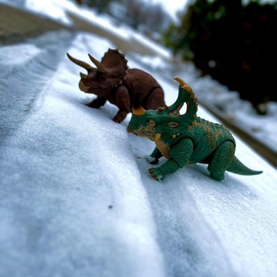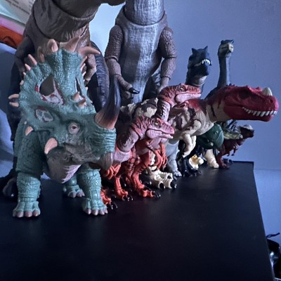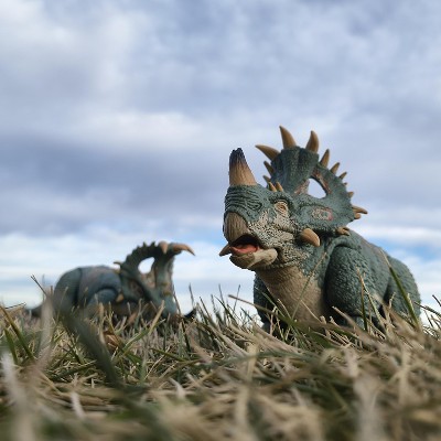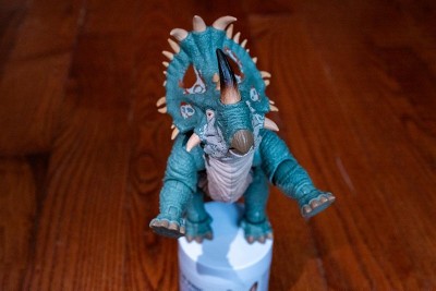 Good sculpt & detail: The figure does a solid job of capturing the look of a ceratopsian dinosaur: the head sculpt, frill, horns, and body texture are nicely done, giving it a “movie-style” dinosaur aesthetic. I think it looks imposing and dinosaur-like rather than cartoonish. • Display and collectible value: With swappable horns (intact and broken), a swappable lower jaw (open/closed mouth), realistic eyes, and a flexible tail — plus many points of articulation — it’s well suited for collectors who like to pose their figures or display them dynamically.