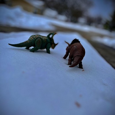 After all this time the Hammond Collection line is slowly going downhill. It made its peak in 2024 with the Giga and Carnotaurus but now it's made it's descent downhill. With removing the glass eyes which was one of the most important details that set this line apart from the mainline toys and adding swappable parts that make no sense and don't need to be there. I'm writing this review as a warning. So far I've purchased this four different times trying to find one with a good enough paint job and that does not have any defects but I have not found that one yet. However the joints are made they are not ideal as trying to twist them to the side before twisting them out will snap little pieces of plastic out. This has happened to me three different times so I know it's with all of them. With every paint job they have little mess-ups and paint splats here and there and it's just applied poorly. The one thing that I appreciate about this figure is the sculpt. Even though it's way too shrunken down in size compared to the Carnotaurus, it does have a nice design and highly resembles the Sinoceratops from the movie. The swappable parts are tricky to pop in and out especially the jaw and they just seem like a waste of plastic. The horn is okay but the mouth could have just been articulated. It just makes less possibility. I wish with all my heart that Mattel would improve this line. It's so hard to watch your favorite product slowly cheapening and degrade. It happens with all companies eventually but it's just hard to take. I hope this review has been helpful. Please. Mattel. Improve.