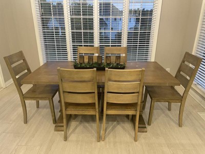 We love the Joanna Dining Table. Well-made and beautiful distressed finish. It was easy to assemble. The modern farmhouse look compliments our space nicely.