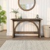 Give your living space a rustic ambiance with this farmhouse style console table. Featuring wood construction with wood grain accents, the table comes with a trestle base and a support beam that adds stability. The table also features curved support beams that add a touch of style and convey an arched elegance, perfect for most any type of decor.