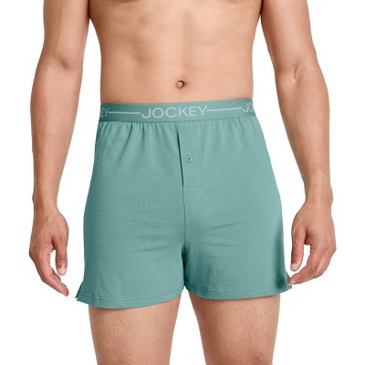 The Jockey ActiveBlend Knit Boxer men's underwear helps keep you comfortable all day with soft, lightweight fabric that wicks sweat to help keep you dry. StayNew technology helps keep these men's boxers looking newer longer, while the button-fly closure offers classic style.