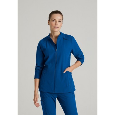 Snap to it in the Jockey Women's Classic Round Neckline Snap Scrub Jacket. A round neckline with color matching cap snap closure provides an updated look, while front and back princess seams offer a flattering fit with two top loading, roomy pockets, and a hidden media pocket. Soft, stretch color-matched knit cuffs help keep the sleeves in place for those on-the-go moments.