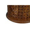 The unmistakable look of genuine hand carved wood shows the high level of craftsmanship that will makes every piece unique. This Compact Drum Table requires no assembly and is made from environmentally sustainable solid mango wood. The curved edge of the table is encompassed by a hand-carved detail pattern with a bold silhouette that creates visual depth. This accent table will look wonderful in the bedroom, living room, or any room that needs a little visual pop. The natural mango wood is sealed with a rich distressed finish to capture the character and beauty that makes each and every table unique.