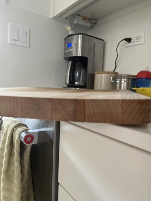 [This review was collected as part of a promotion.] The size of the 16” cutting board is perfect for cutting multiple veggies or some poultry. The thickness shows how durable it is and it’s easy to store. The wood is so pretty. Maintenance is a lot though with having to oil it once a month.