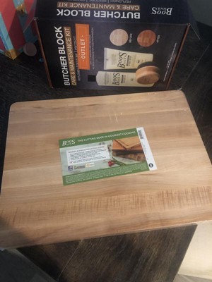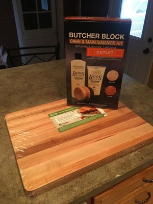 [This review was collected as part of a promotion.] This cutting board has the perfect dimensions to for how I like to chop and organize my ingredients to create my culinary masterpieces. The grain is beautiful and it looks great on my counter. The kit to maintain and restore wood works great and I used it on my old cutting board, looks like new.