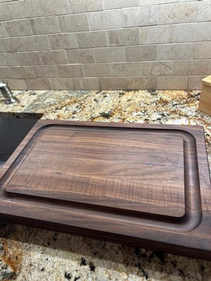 [This review was collected as part of a promotion.] John Boos Reversible 18” Barbecue Carving Cutting Board with Juice Groove, walnut is a beautiful cutting board. It is very heavy and versatile. Can be used as a cutting or charcuterie board.