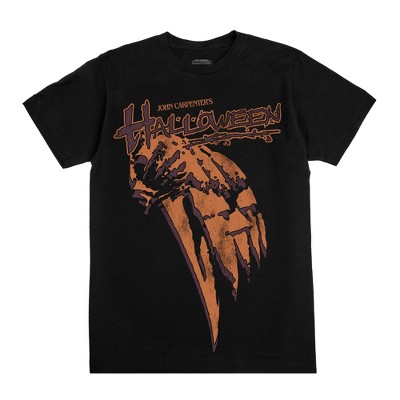 Bring chilling retro style to your wardrobe with this adult black John Carpenter's Halloween crew neck short sleeve t-shirt. Featuring a monochrome version of the film's iconic knife and jack-o'-lantern poster art, this tee channels classic horror energy. Made from soft cotton, it delivers all-day comfort. Machine wash it on cold with like colors and tumble dry on low heat. Use only non-chlorine bleach when needed. Do not iron or dry clean.