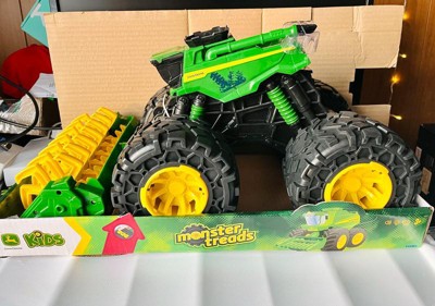Go big or go home! This ginormously scaled Monster Treads combine measures nearly 18 inches long x 10.50 inches wide x 9.50 inches tall and is the largest Monster Treads toy ever created! It also features lights and sounds activated by three different buttons. Additionally, it features super bouncy tires, uniquely designed tire treads and a spinning combine head that is activated by rolling the combine forward. The best of both worlds collide when the power of John Deere meets monster vehicle styling!