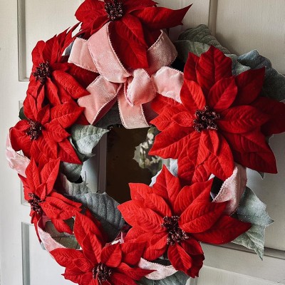 Wonderful medley of happy colors. The Poinsettias are a rich ruby red, with a soft pink velvet bow weaved throughout the green leaves. Vibrant colors on top of a well made sturdy wreath.