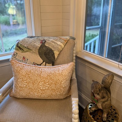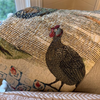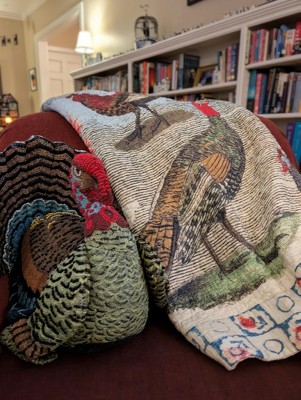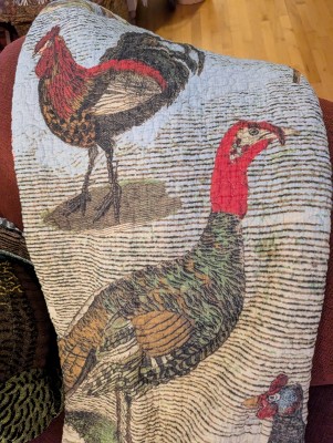 The bird design is so fantastic, I knew I had to have this throw as soon as I saw the online preview of this collection. A couple of minor cons: I agree with another reviewer that the printed fabric is a rougher texture like gauze, but after washing and tumble drying, it softened up. Second, unlike the other two quilted throws in this collection, there is no reverse print, which is too bad. Maybe it would have made it more expensive, and I appreciate the price point. Pros: If you love fowl, quirky wildlife prints, and a vivid color palette, this is for you. It looks great with John Derian's previous Thanksgiving collection turkey pillows. It's also generously sized.